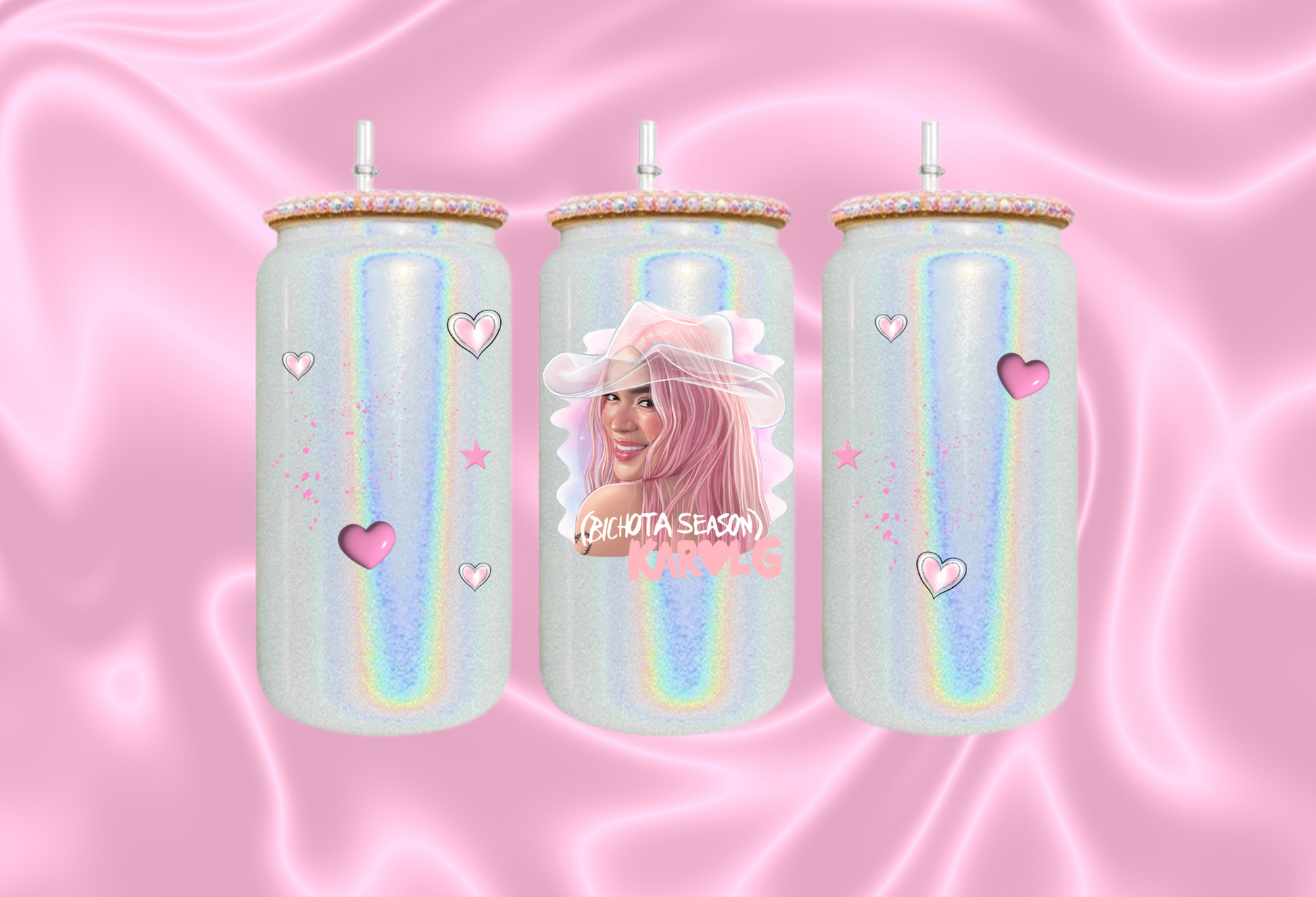 Grab your favorite icy beverage with Karol G's dazzling 16 oz White Shimmer glass can and exquisite Rhinestone lid, along with a clear plastic straw. Plus, convenient cleaning instructions are included! An incomparable gift for any occasion, this glass can is sure to wow! However, please note that each item is made just for you, so returns are not an option.